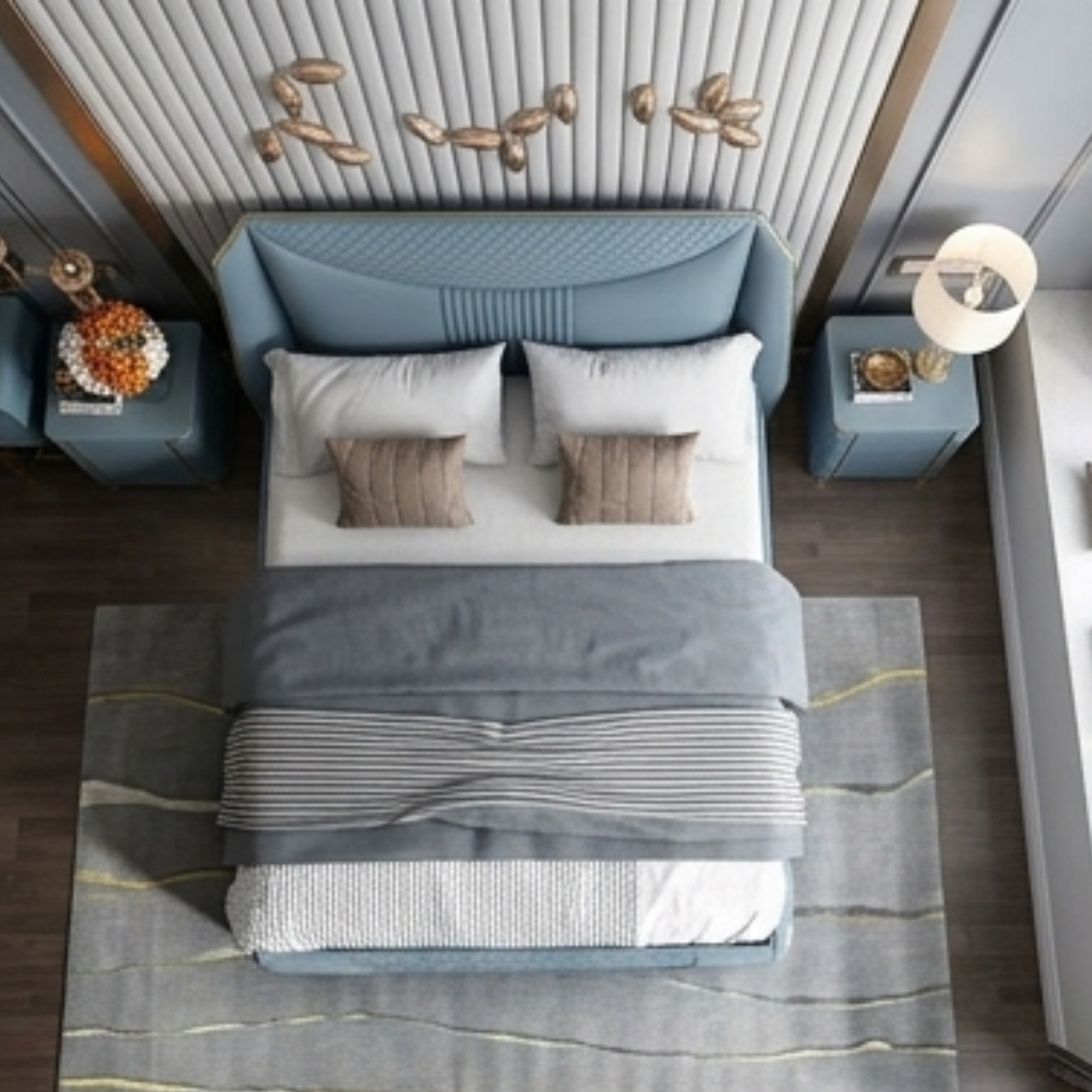 - Integrated Storage Design: Comes with two matching blue leather-wrapped bedside drawers for a unified look.