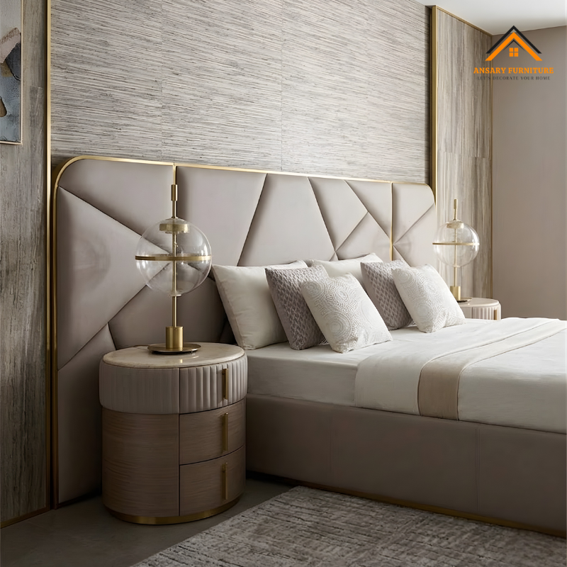 - Designer Headboard: Unique multi-panel geometric design with gold-finish accents.
