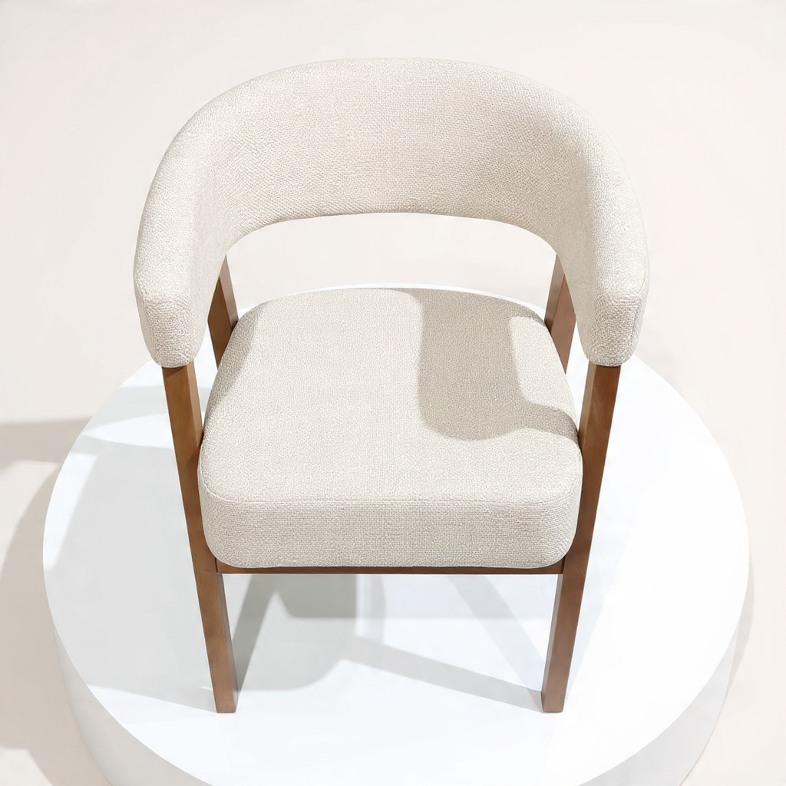 The chair features a distinct C-shaped backrest that doubles as integrated armrests, providing superior lumbar support for long dinner parties or focused work sessions. The seat is padded with high-density foam and wrapped in a premium textured fabric in a neutral ivory tone, ensuring it complements both contemporary and classic décor.