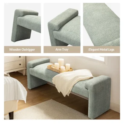 Featuring sturdy wooden outriggers and elegant metal legs, the bench offers both stability and a sleek design. The integrated arm trays on either side provide extra functionality, perfect for placing small items like books or trays. Whether placed at the foot of your bed, in your living room, or entryway, the SoftNest Designer Bench enhances your décor with its minimalist yet inviting presence.
